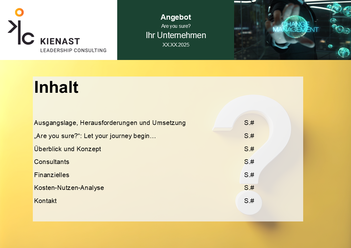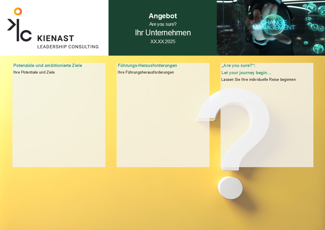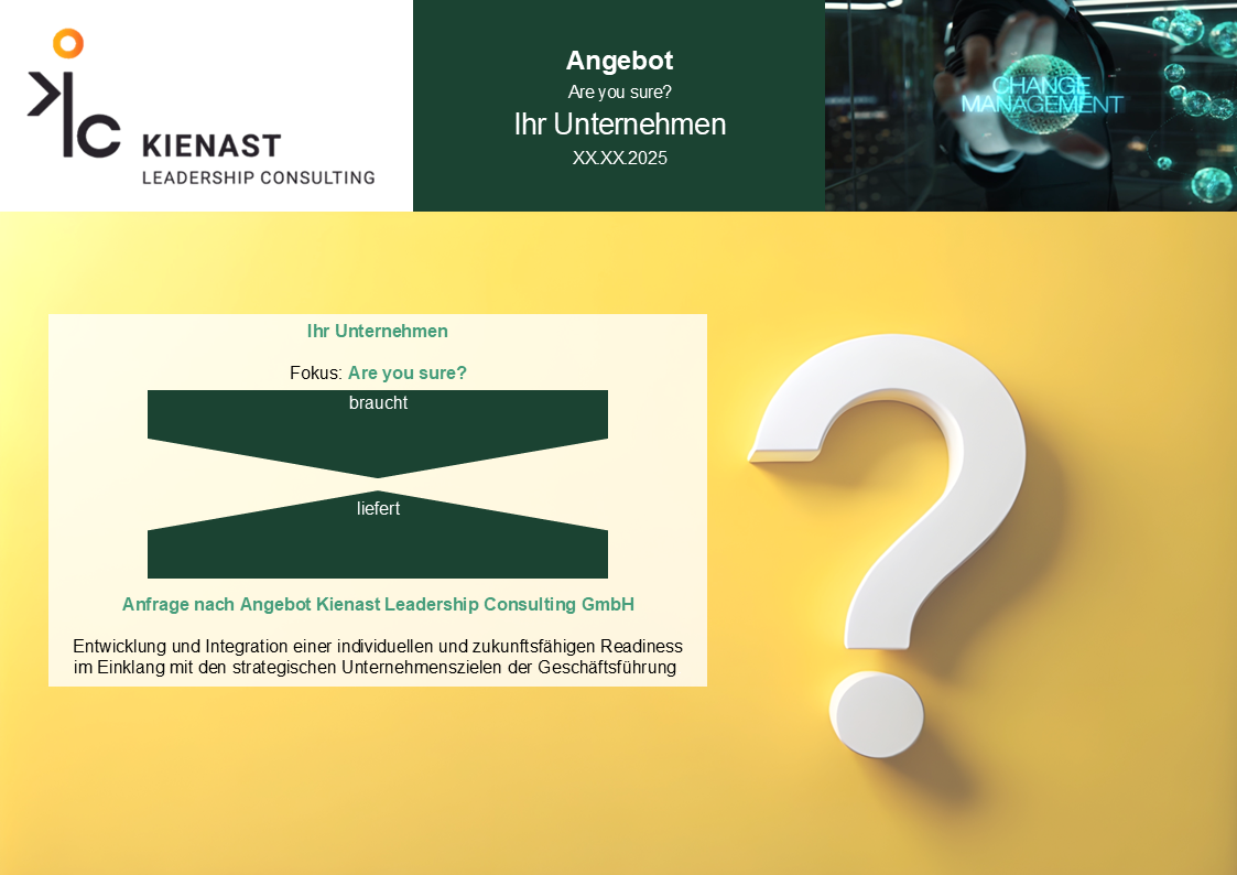 Unser Angebot hilft Ihnen, Veränderungsbereitschaft gezielt aufzubauen und sicherzustellen, dass Ihr Unternehmen nicht nur kurzfristige Anpassungen meistert, sondern langfristig erfolgreich bleibt.