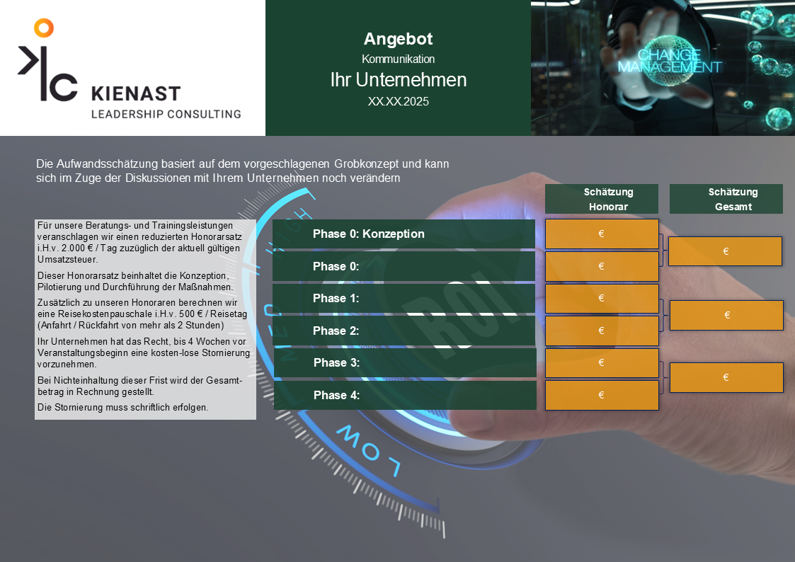 Dieses Angebot basiert auf einem strukturierten Grobkonzept, das individuell auf Ihr Unternehmen abgestimmt wird. Die geschätzten Kosten umfassen Konzeption, Entwicklung, Umsetzung und Nachbereitung der Kommunikationsmaßnahmen. Während der Projektlaufzeit können Anpassungen vorgenommen werden, um den tatsächlichen Bedarf optimal abzubilden. So bleibt Ihre Investition flexibel und effizient.