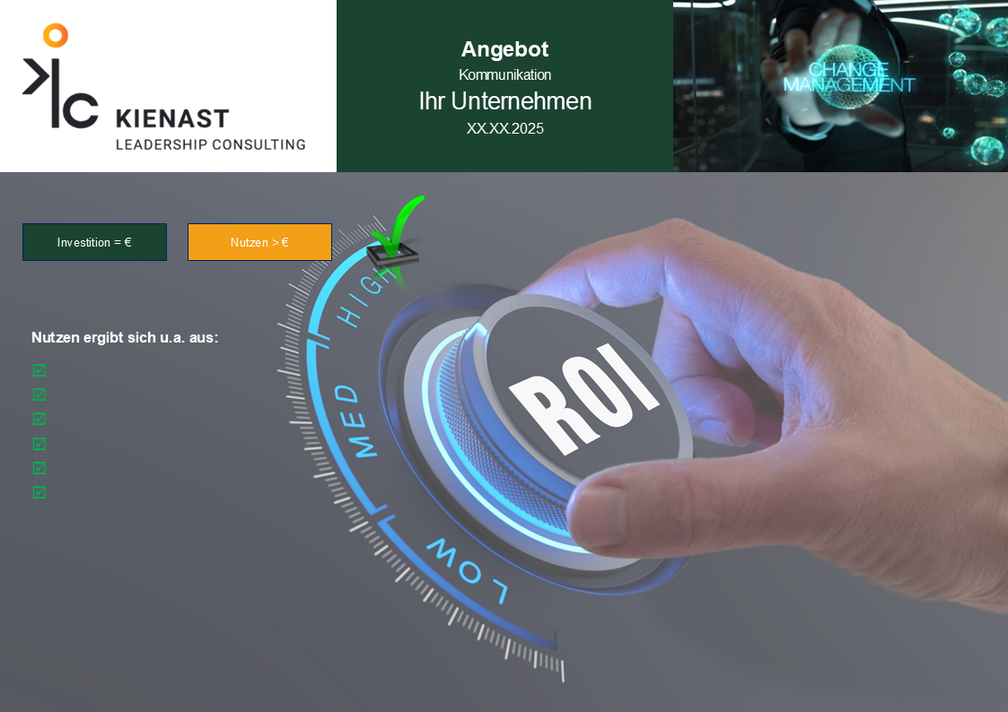 Durch eine detaillierte Kosten-Nutzen-Analyse erhalten Sie Einblick in den erwarteten Return on Investment (ROI) Ihrer Change-Kommunikation. Der Nutzen ergibt sich aus gesteigerter Akzeptanz, erhöhter Effizienz und reduzierten Widerständen im Veränderungsprozess.