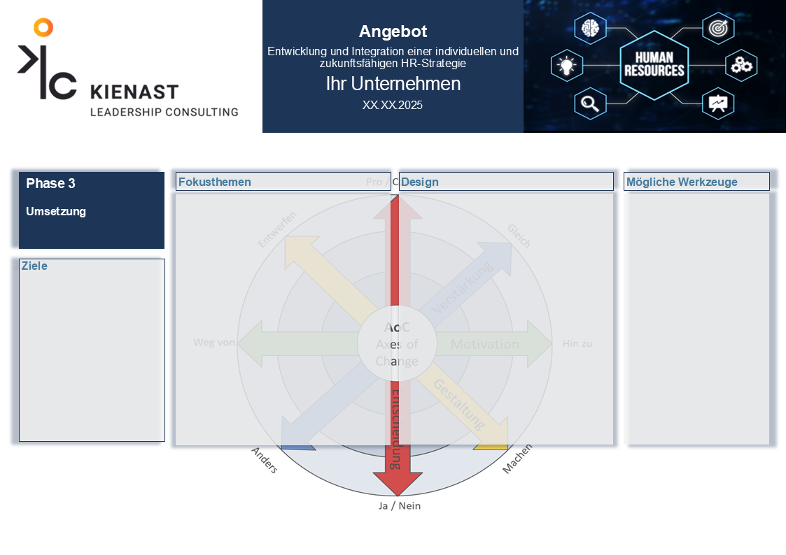 Jetzt geht es an die konkrete Gestaltung Ihrer individuellen HR-Strategie. Basierend auf den Analyseergebnissen entwickeln wir Konzepte, die Ihre Organisation optimal auf zukünftige Herausforderungen vorbereiten.