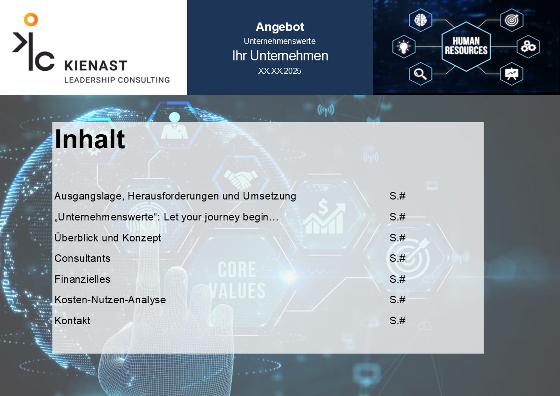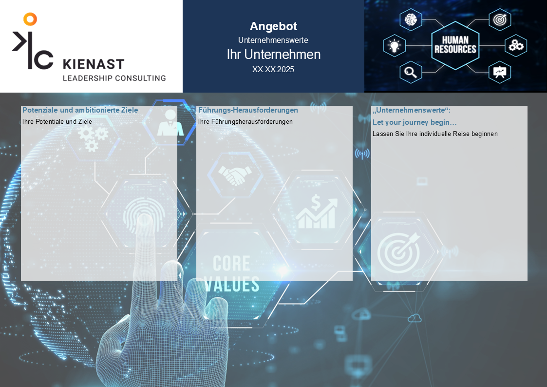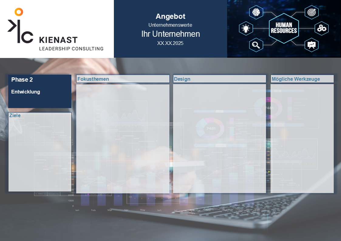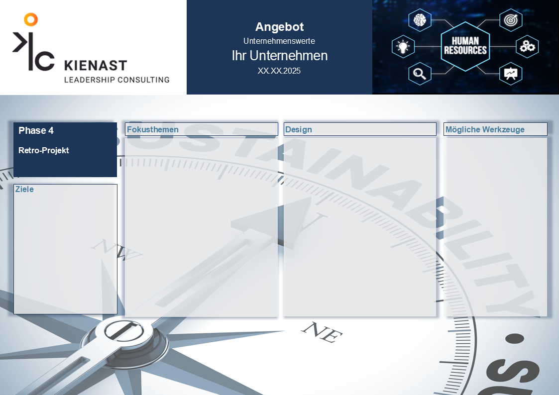 Sie erhalten eine klare Übersicht über den gesamten Prozess: von der Analyse Ihrer aktuellen Werte über die Entwicklung eines individuellen Wertemodells bis hin zur erfolgreichen Implementierung.