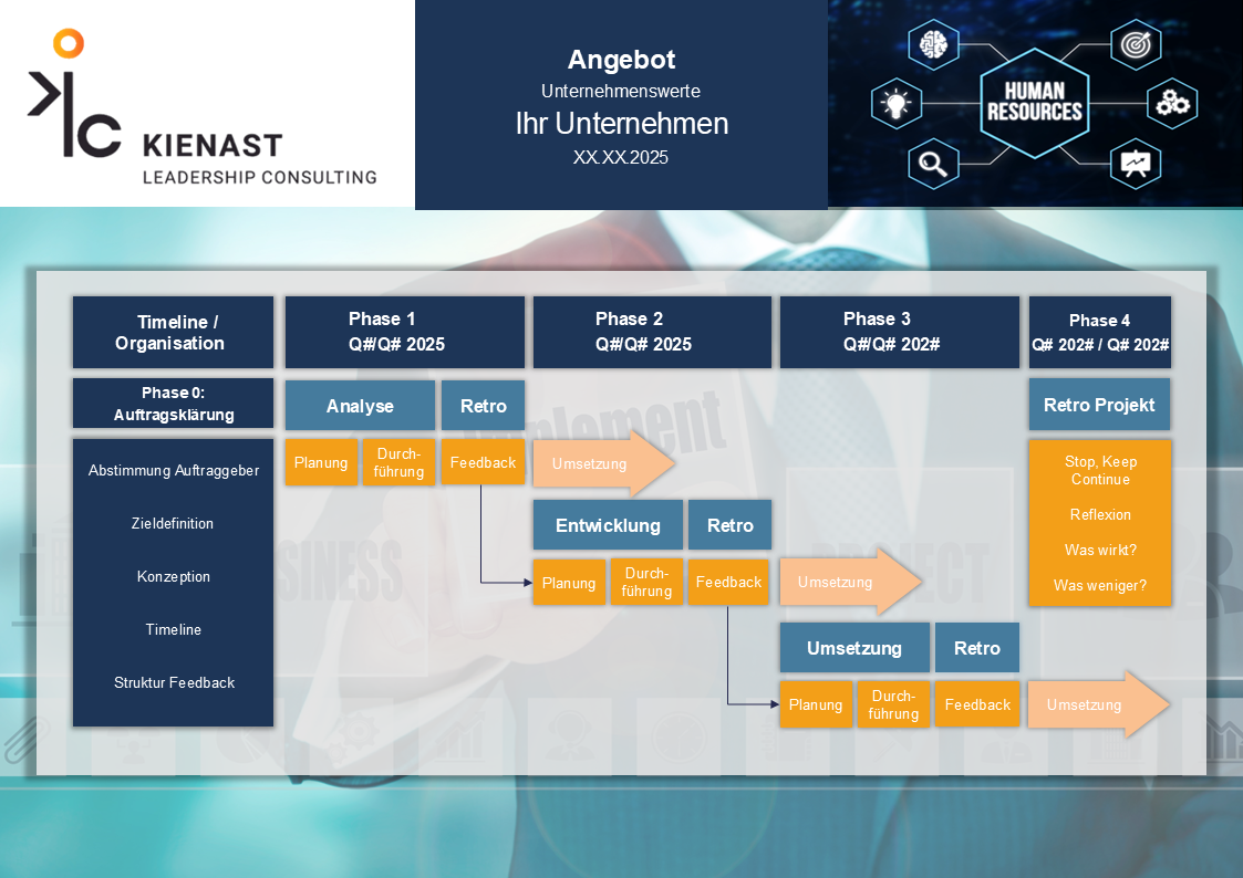 Durch einen klar definierten Zeitplan mit Feedback-Phasen stellen wir sicher, dass Ihre Unternehmenswerte nachhaltig implementiert werden.