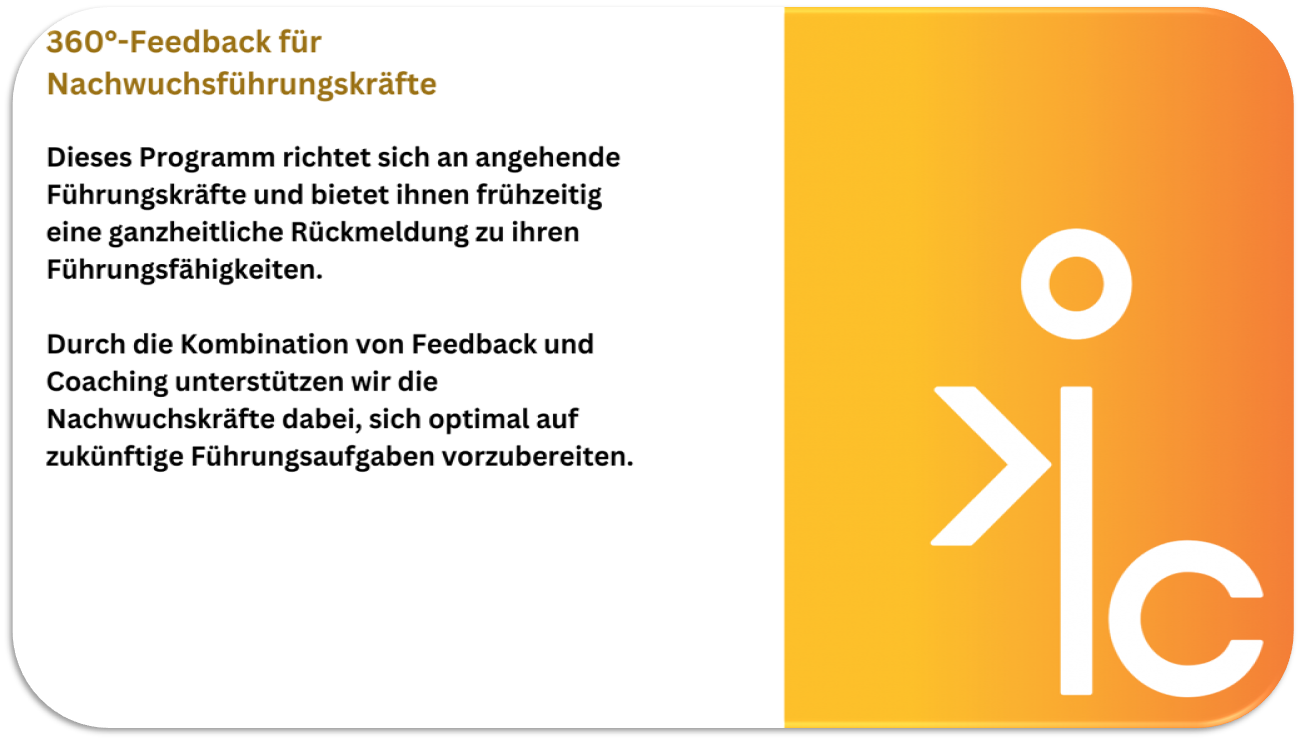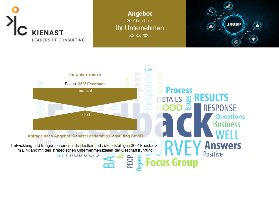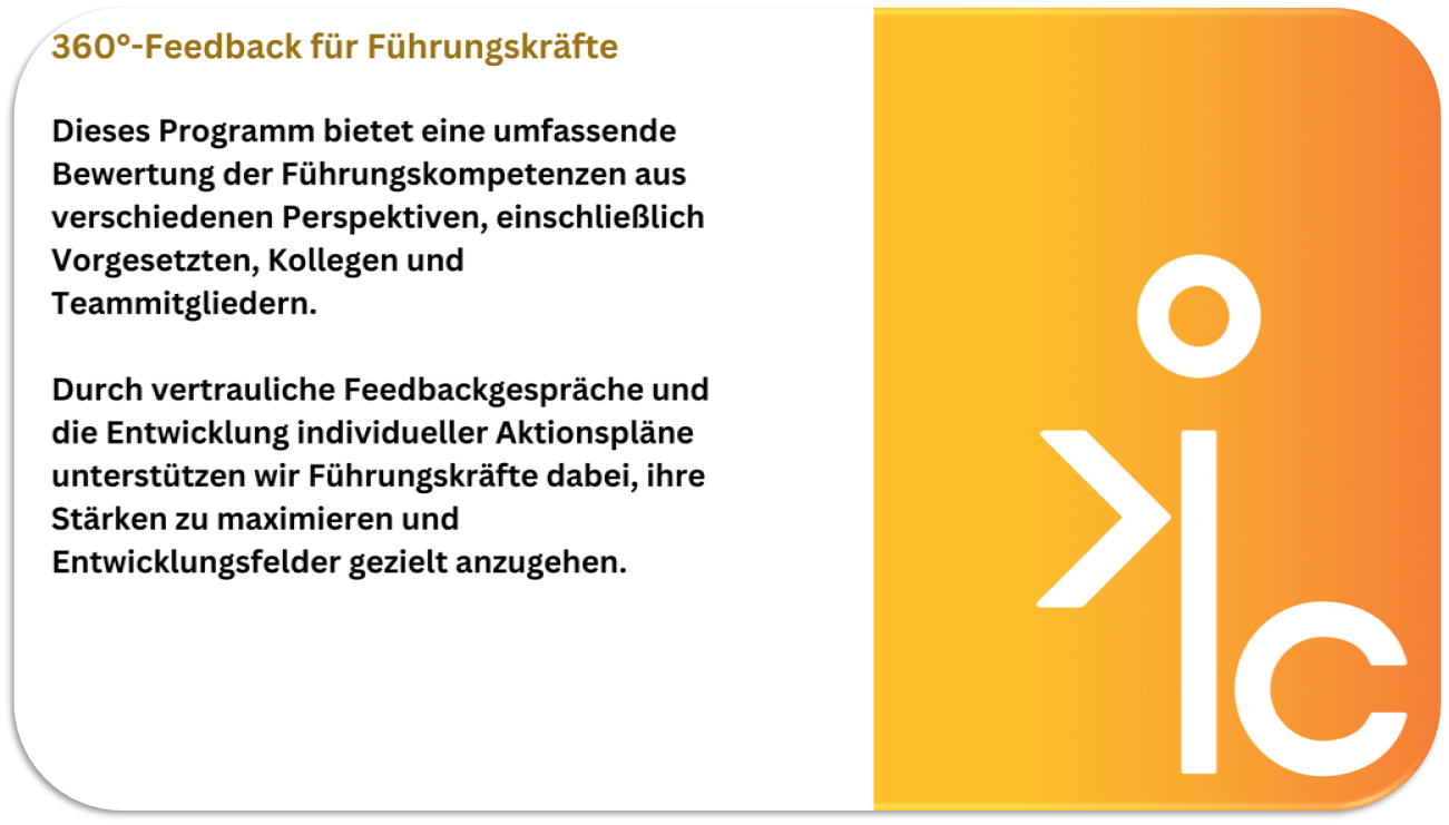 Erhalten Sie ein maßgeschneidertes 360°-Feedback für eine gezielte und nachhaltige Führungskräfteentwicklung in Ihrem Unternehmen. Unser Angebot bietet Ihnen eine fundierte Analyse der Führungsqualität und wertvolle Einsichten zur Weiterentwicklung Ihrer Führungskräfte. Profitieren Sie von einem strukturierten, bewährten Prozess, der auf Transparenz, Effizienz und individueller Anpassung basiert. Gemeinsam definieren wir die Ziele, setzen einen klaren Rahmen und schaffen eine Feedbackkultur, die zu messbaren Erfolgen führt. Ihre Führungskräfte erhalten differenziertes Feedback aus verschiedenen Perspektiven – für eine gezielte Entwicklung und nachhaltigen Unternehmenserfolg.