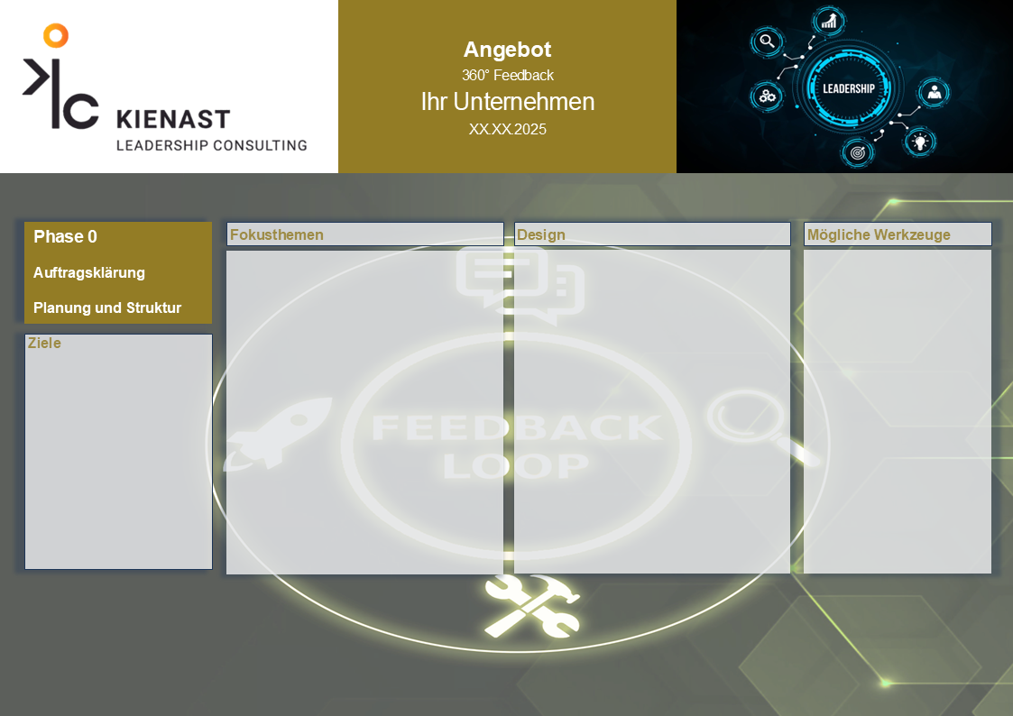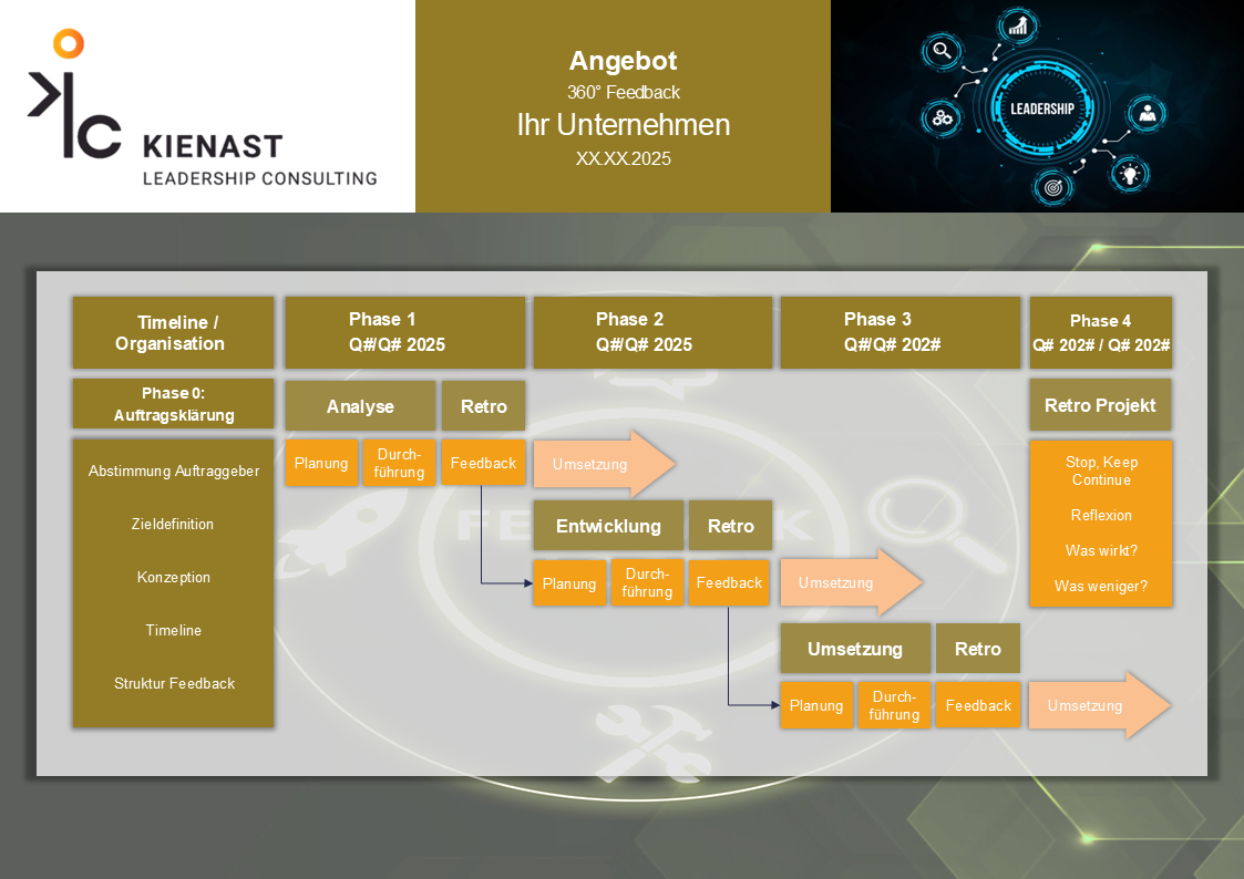 Verschaffen Sie sich einen Überblick über den strukturierten Ablauf des 360°-Feedback-Prozesses. Das Angebot umfasst eine detaillierte Analyse Ihrer aktuellen Herausforderungen, die methodische Herangehensweise sowie eine klare Kosten-Nutzen-Bewertung. Erfahren Sie mehr über unser Konzept, unsere Berater und die finanziellen Rahmenbedingungen. Zudem erhalten Sie eine Übersicht über die einzelnen Phasen, von der Planung bis zur Umsetzung. Unser strukturierter Ansatz stellt sicher, dass das Feedback zielführend eingesetzt wird und nachhaltige Verbesserungen in Ihrer Führungsentwicklung erzielt werden.