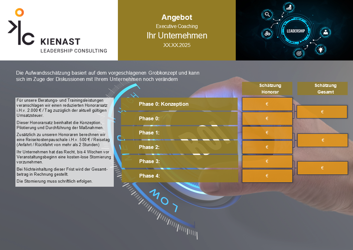 Eine fundierte Budgetplanung ist entscheidend. Sie erhalten eine detaillierte Aufwandsabschätzung für das Coaching, basierend auf den verschiedenen Projektphasen. Die Kosten können individuell angepasst werden, um optimal auf Ihre unternehmerischen Bedürfnisse einzugehen. Dabei berücksichtigen wir sowohl die Konzeption als auch die Umsetzung und Nachbereitung des Coachings.