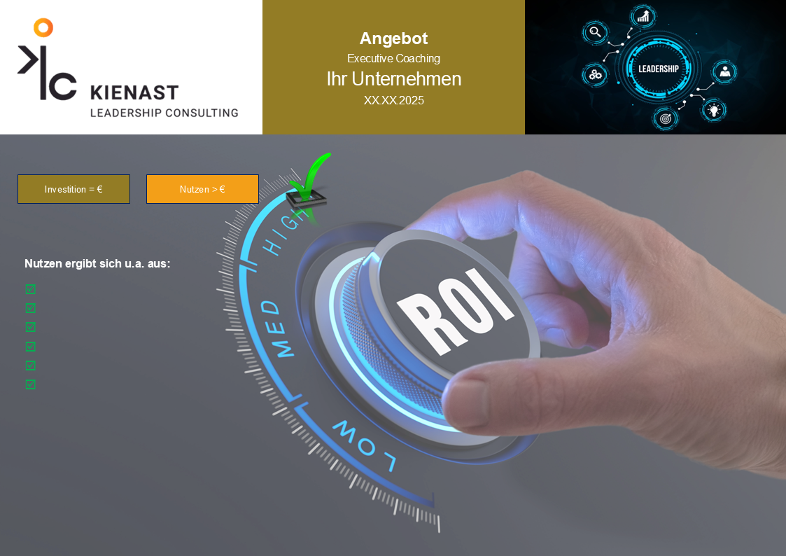 Jede Investition in Führungskräfte-Entwicklung muss sich lohnen. Durch unser Coaching steigern Sie langfristig die Leistungsfähigkeit Ihrer Führungskräfte, verbessern die Unternehmenskultur und erhöhen die Mitarbeiterbindung. Hier erhalten Sie eine Kosten-Nutzen-Analyse, die zeigt, wie das Coaching einen nachhaltigen Mehrwert für Ihr Unternehmen schafft und einen positiven Return on Investment (ROI) erzielt.