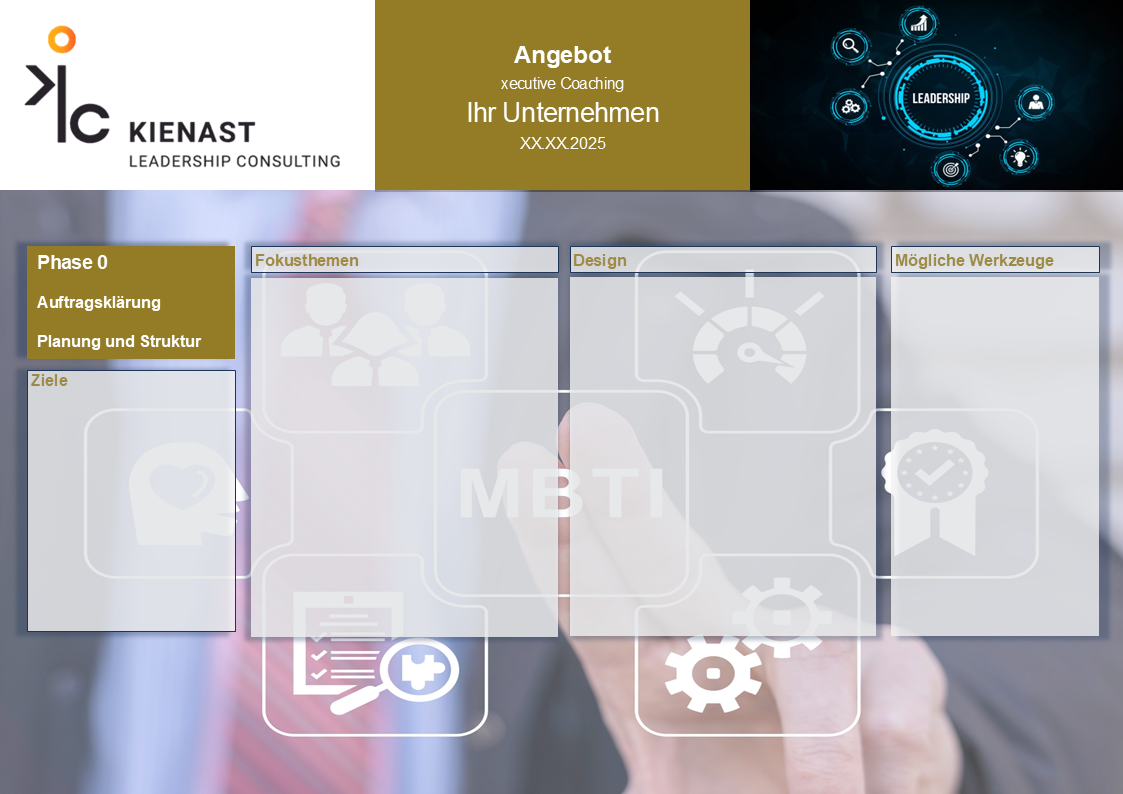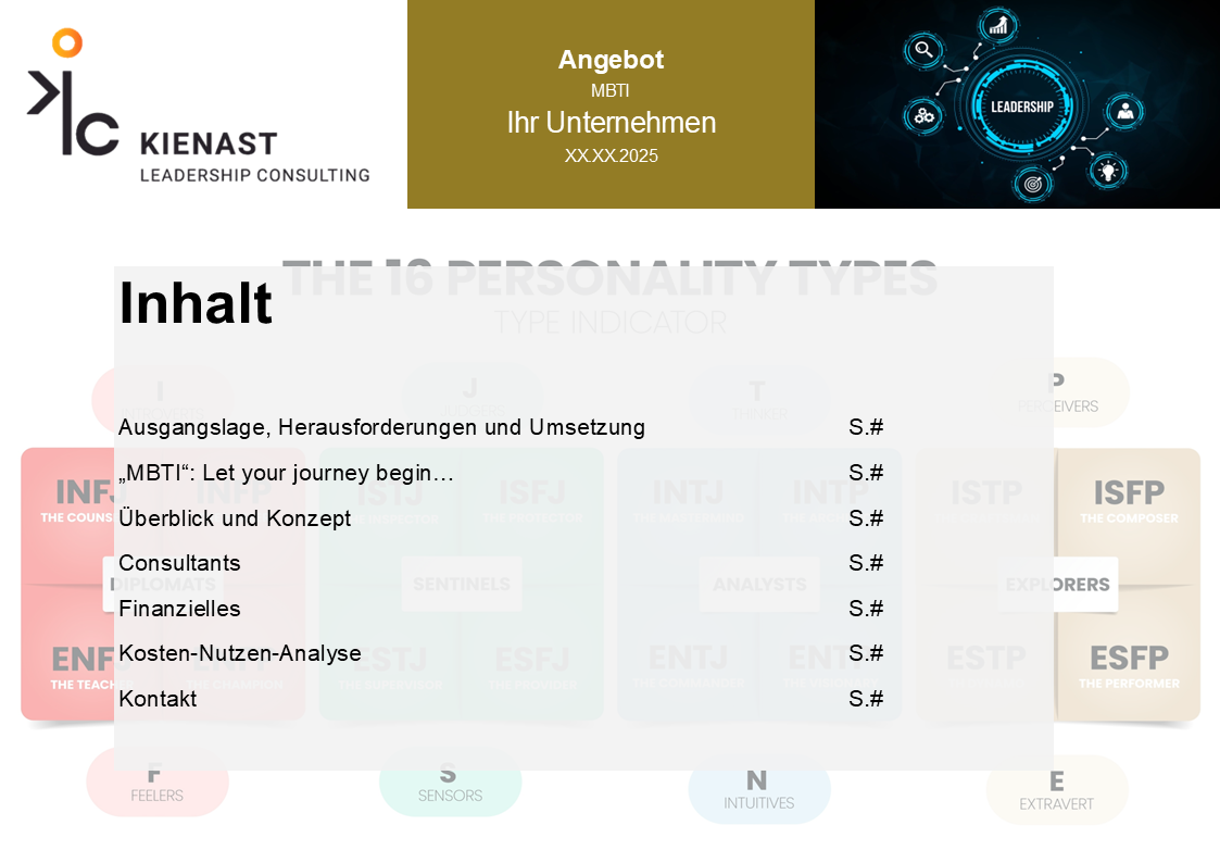 Ein strukturierter Überblick über das Angebot, um Ihnen eine klare Orientierung zu geben. Hier finden Sie die wichtigsten Inhalte, darunter eine Analyse der Ausgangslage, die methodische Herangehensweise an die MBTI-Analyse, das Konzept, finanzielle Aspekte und die Kosten-Nutzen-Analyse. Transparenz und Nachvollziehbarkeit stehen im Mittelpunkt, damit Sie genau wissen, was Sie erwarten können.