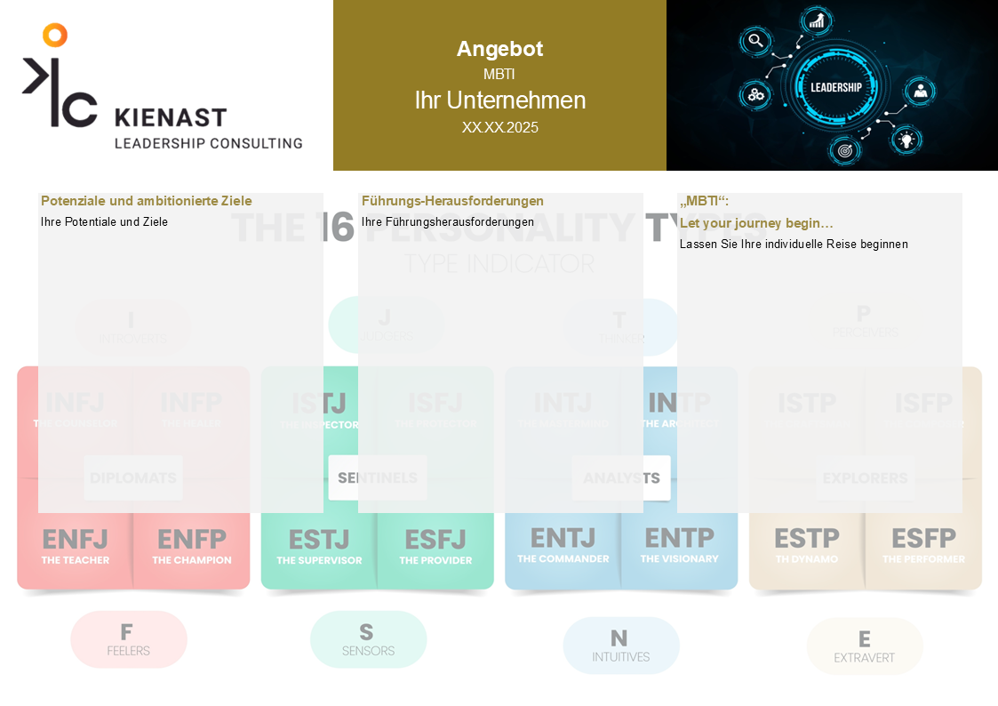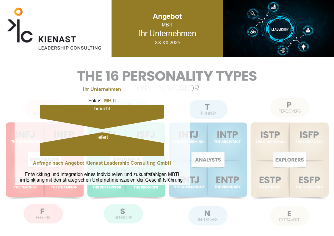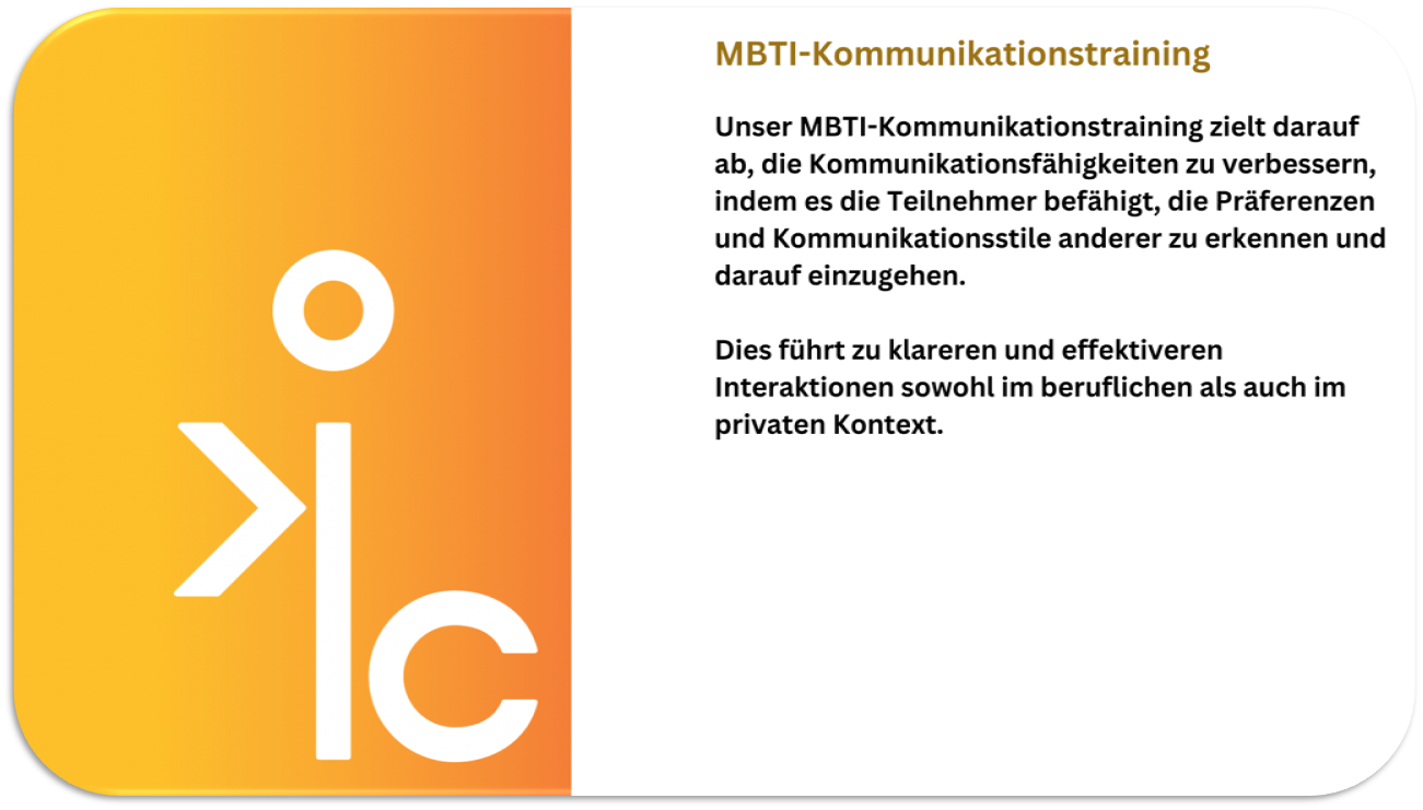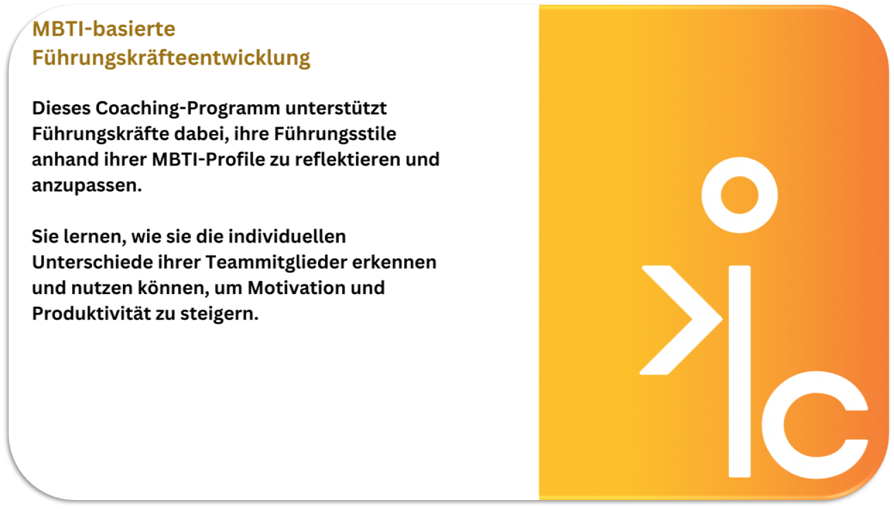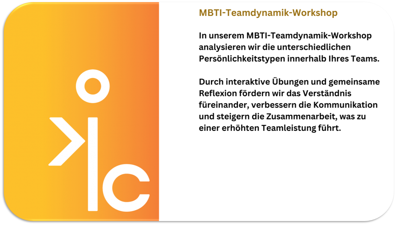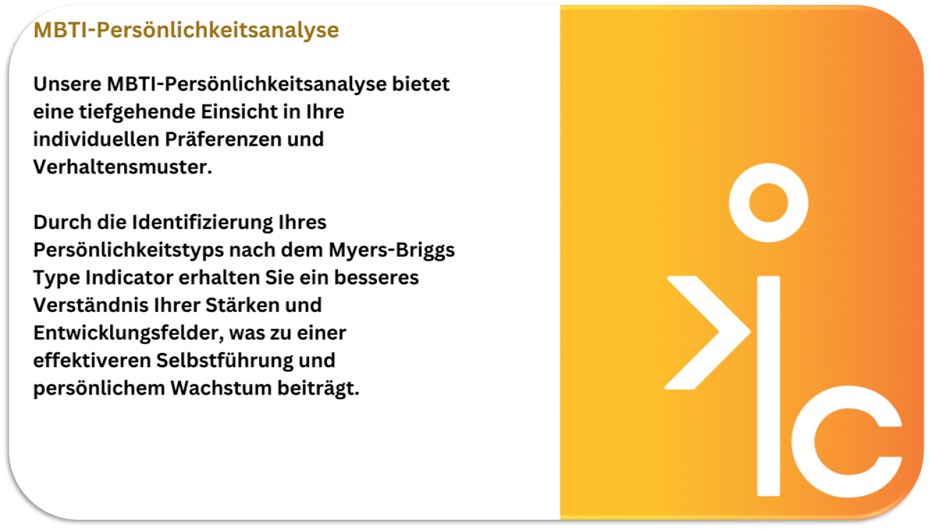 Sie möchten die individuellen Stärken Ihrer Mitarbeitenden erkennen und die Teamdynamik verbessern? Dieses Angebot zur MBTI-Analyse unterstützt Ihr Unternehmen dabei, die Persönlichkeitsprofile Ihrer Teams zu verstehen und gezielt weiterzuentwickeln. Der Myers-Briggs-Typenindikator (MBTI) hilft Ihnen, Potenziale zu identifizieren, Kommunikation zu optimieren und die Zusammenarbeit zu stärken. Lassen Sie uns gemeinsam einen maßgeschneiderten Ansatz für Ihre Unternehmensbedürfnisse entwickeln.