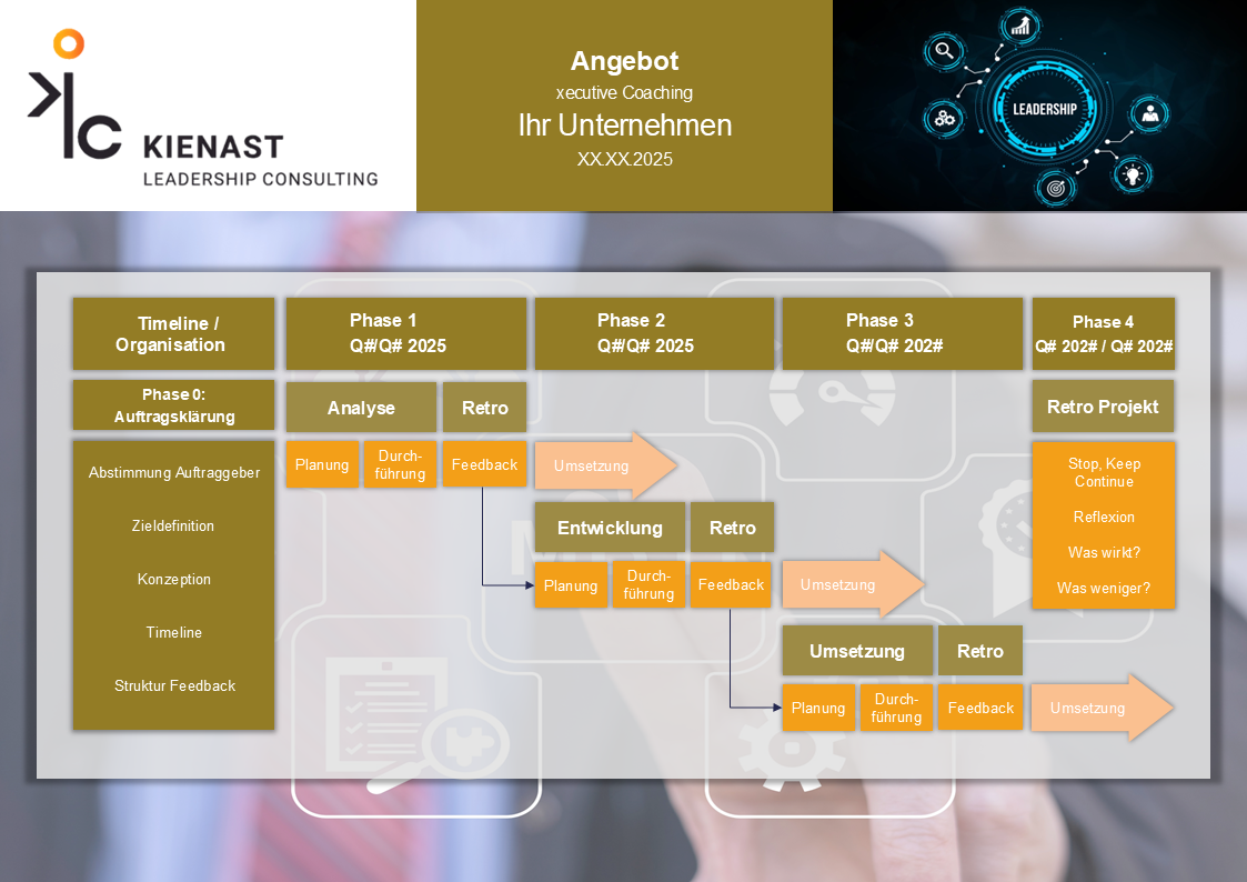 Strukturierte Phasen von der Auftragsklärung bis zur Umsetzung. Durch eine iterative Vorgehensweise mit regelmäßigen Retrospektiven wird sichergestellt, dass der Prozess flexibel an Ihre Unternehmensbedürfnisse angepasst werden kann. Jede Phase wird detailliert geplant, durchgeführt und evaluiert, um nachhaltige Ergebnisse zu gewährleisten.