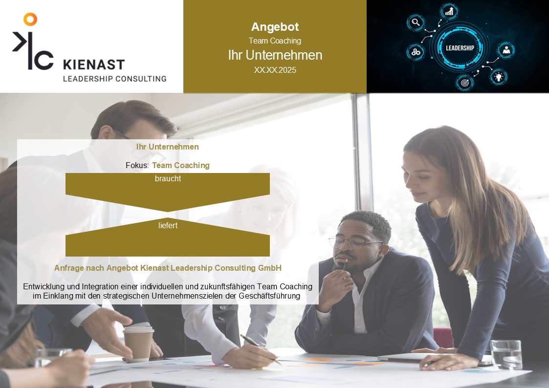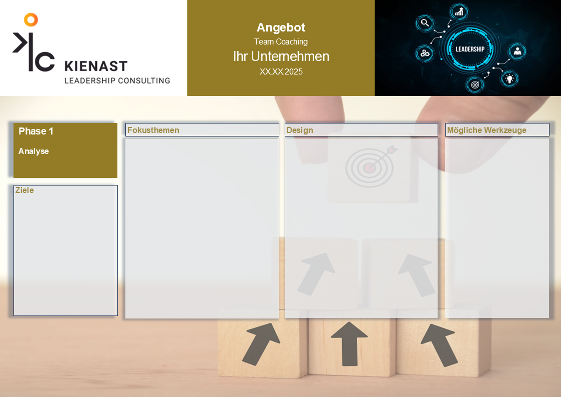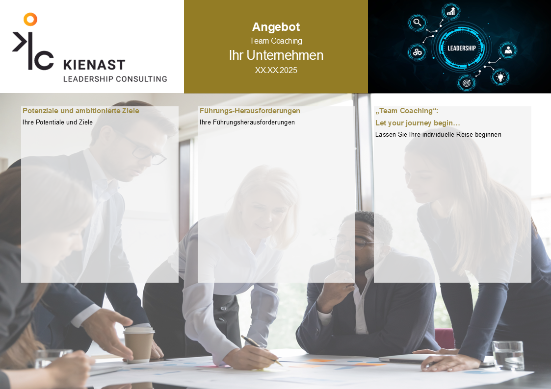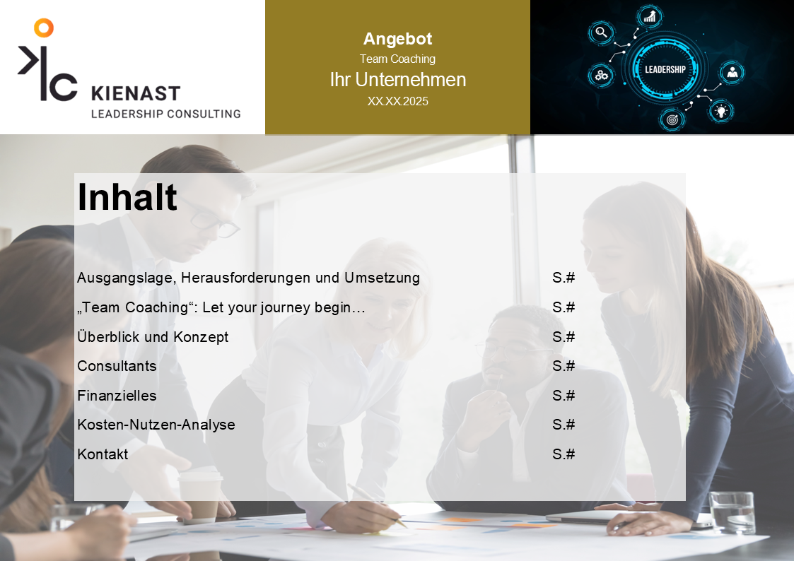 Erhalten Sie einen umfassenden Überblick über die Inhalte dieses Angebots. Es beginnt mit einer Analyse Ihrer aktuellen Herausforderungen und zeigt Ihnen den Weg zu einer erfolgreichen Umsetzung von Team Coaching. Wir beleuchten den Coaching-Prozess, unser methodisches Konzept und die beteiligten Experten. Zusätzlich erhalten Sie detaillierte Informationen zu finanziellen Aspekten sowie einer Kosten-Nutzen-Analyse. Unser Ziel ist es, Ihnen eine klare Vorstellung davon zu vermitteln, wie unser Coaching-Ansatz speziell auf Ihr Unternehmen zugeschnitten wird, um nachhaltige Verbesserungen in der Teamdynamik zu erreichen.