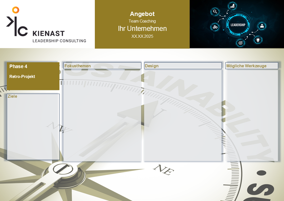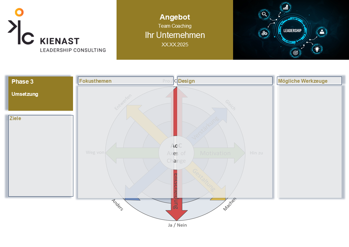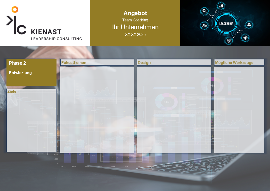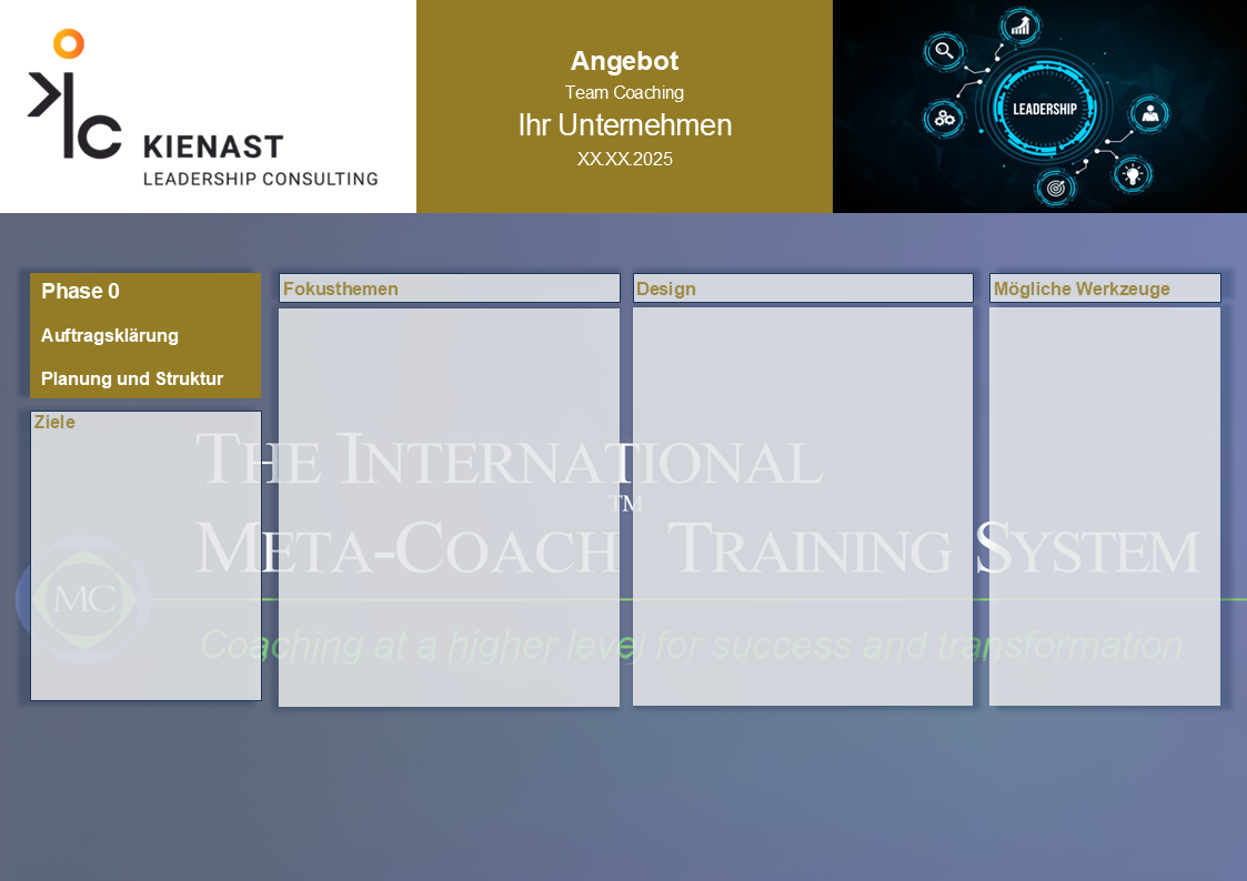 Erhalten Sie einen umfassenden Überblick über die Inhalte dieses Angebots. Es beginnt mit einer Analyse Ihrer aktuellen Herausforderungen und zeigt Ihnen den Weg zu einer erfolgreichen Umsetzung von Team Coaching. Wir beleuchten den Coaching-Prozess, unser methodisches Konzept und die beteiligten Experten. Zusätzlich erhalten Sie detaillierte Informationen zu finanziellen Aspekten sowie einer Kosten-Nutzen-Analyse. Unser Ziel ist es, Ihnen eine klare Vorstellung davon zu vermitteln, wie unser Coaching-Ansatz speziell auf Ihr Unternehmen zugeschnitten wird, um nachhaltige Verbesserungen in der Teamdynamik zu erreichen.