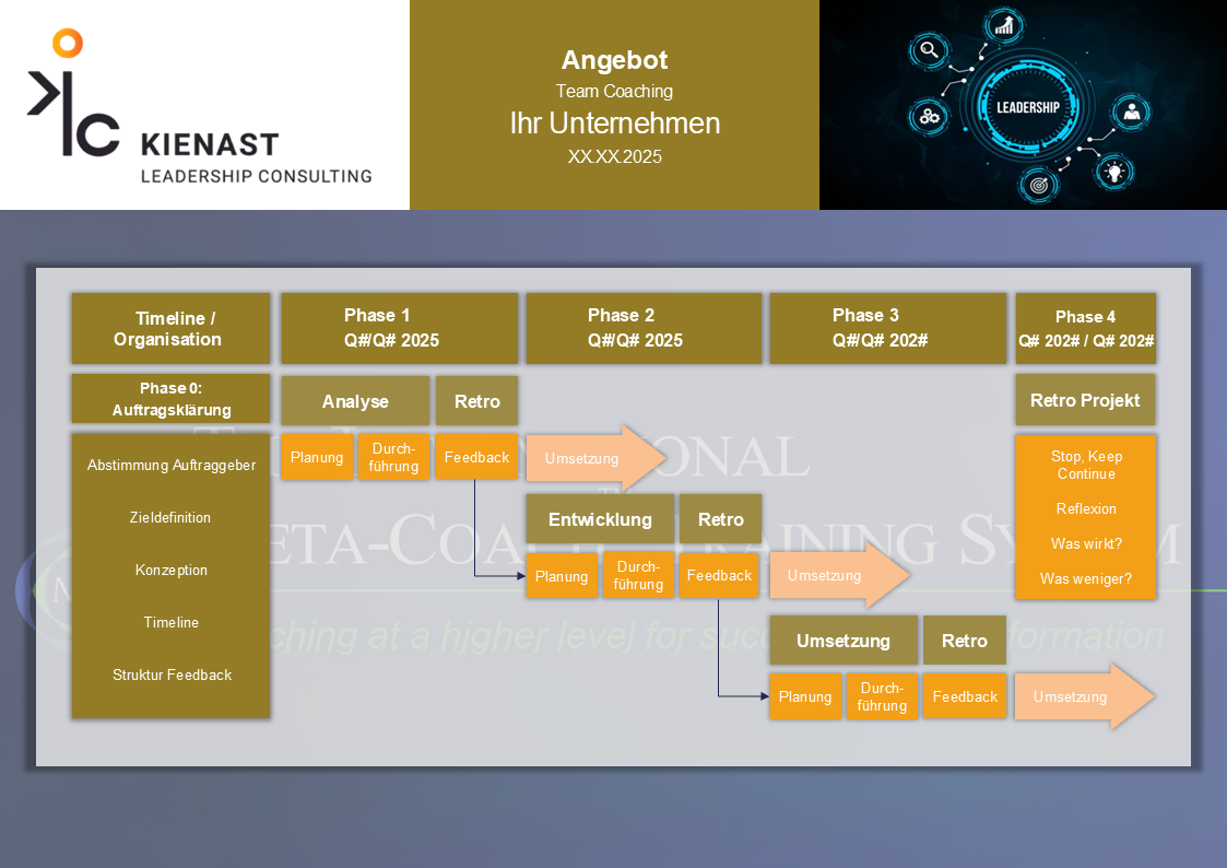 Ein erfolgreicher Wandel benötigt Struktur und klare Planung. Unser Zeitplan zeigt Ihnen die einzelnen Phasen des Team Coachings – von der ersten Auftragsklärung über die Analyse und Entwicklung bis hin zur Umsetzung und Reflexion. Jede Phase wird durch Feedbackschleifen ergänzt, um den Fortschritt kontinuierlich zu optimieren. So stellen wir sicher, dass alle Maßnahmen effektiv sind und langfristig wirken. Unsere strukturierte Vorgehensweise ermöglicht Ihnen maximale Transparenz und Planbarkeit, sodass Ihr Team schrittweise zu mehr Effizienz, besserer Kommunikation und nachhaltiger Zusammenarbeit geführt wird.